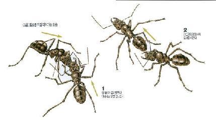 ¾Èµû¶ó¿À¸é ÀÔ¿¡ ¹°¾î ²ø°í°¡ °³¹Ìµé Áß ºñ±³Àû ¿ø½ÃÀûÀÎ Á¾Àϼö·Ï ¸öÁþÀ» ¸¹ÀÌ ¾²´Â °æÇâÀÌ ÀÖ´Ù. ÀÌ °³¹ÌµéÀº ÀÚ½ÅÀÌ ¸ÔÀ̸¦ ¹ß°ßÇÑ °÷À¸·Î µ¿·áµéÀ» µ¿¿øÇÒ ¶§ Çѹø¿¡ ÇÑ ¸í ¹Û¿¡ µ¥·Á°¡Áö ¸øÇÑ´Ù. ÀÏ´Ü µ¿·á Àϰ³¹Ì¸¦ ¸¸³ª¸é ¾ÈÅ׳ª·Î ¸î ¹ø °Çµå¸° ´ÙÀ½ µ¹¾Æ¼¼ ¸ÕÀú ¸ñÀûÁö¸¦ ÇâÇØ °È±â ½ÃÀÛÇÑ´Ù. ±×·¯¸é µ¿·á Àϰ³¹Ì´Â ¾Õ¼ °¡´Â °³¹ÌÀÇ ¸ö¿¡ ´êÀ» µí ¹Ù¦ ºÙ¾î µÚ¸¦ ÂѴ´Ù(±×¸²). ¶§·Ð µÚµû¶ó °¡´ø °³¹Ì°¡ ¾Õ¼ °¡´Â °³¹Ì¸¦ ³õÄ¡±âµµ ÇÑ´Ù. ¾Õ¼ °¡´ø °³¹Ì´Â µ¿·áÀÇ ¾ÈÅ׳ª°¡ Àڱ⠸ö¿¡ °Çµå·ÁÁöÁö ¾ÊÀ¸¸é °ÉÀ½À» ¸ØÃß°í µÚµ¹¾Æ¼ µ¿·á¸¦ ã´Â´Ù. µ¿·á°¡ Àß µû¶ó¿ÀÁö ¾ÊÀ» ¶§´Â ÀÔÀ¸·Î ¹°¸ç ²ø¾î´ç±â±âµµ ÇÑ´Ù. ÀÌ·¯ÇÑ ÇൿÀ» º´·ÄÁÖÇà(tandem running)À̶ó ºÎ¸£´Âµ¥, ¾î¶»°Ô ÀÌ·± ºñÈ¿À²ÀûÀÎ ÀÇ»ç¼ÒÅë ¹æ¹ýÀ¸·ÎºÎÅÍ ³¿»õ±æÀ» ³õ¾Æ ÇѲ¨¹ø¿¡ ¿©·¯ µ¿·áµéÀ» µ¿¿øÇÒ ¼ö ÀÖ´Â ´ëÁß Àü´Þ ¼ö´ÜÀÌ ÁøÈµÉ ¼ö ÀÖ¾ú´Â°¡´Â ´ë´ÜÈ÷ Èï¹Ì·Î¿î ¿¬±¸°úÁ¦°¡ ¾Æ´Ò ¼ö ¾ø´Ù. |