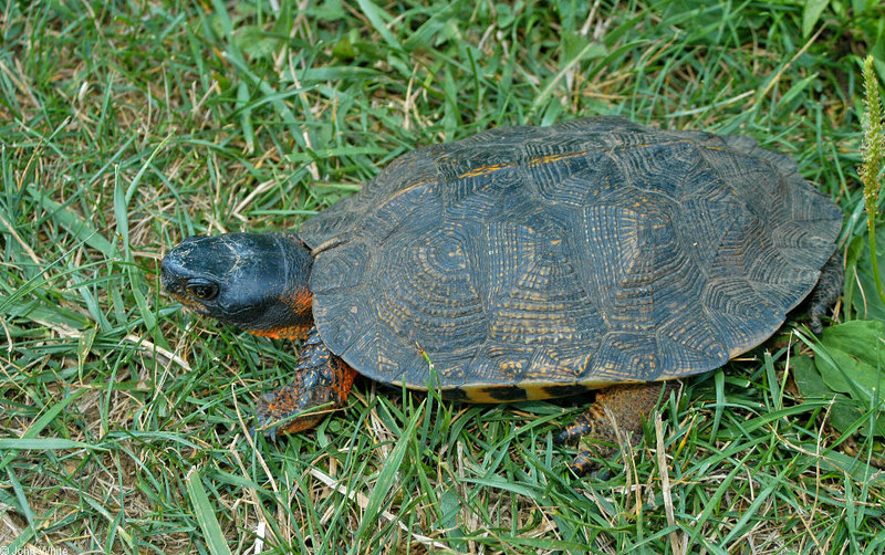 | Wood Turtle (Glyptemys insculpta) is one of two species in the genus Glyptemys, both of which are limited to North America. Until 2002, the Wood Turtle was placed in the genus Clemmys but genetic analyses revealed that the Wood Turtle and Bog Turtle formed a distinct group. The Wood Turtle reaches carapace lengths of 6 to 9 inches. The wood turtle is accurately named, and spends most of its time in wooded areas. It is, however, also semi-aquatic and dependent on streams, rivers, and ponds. |