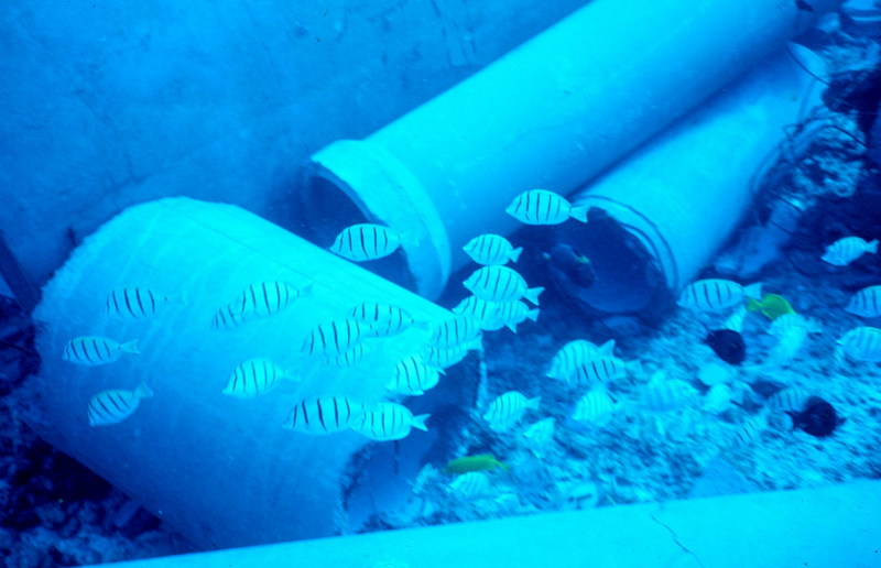 Schooling surgeonfish -Acanthuris sandvicensis (manini or convict tang) Schooling with yellow tang - Zebrasoma flavescens Among first to discover new artificial reef.