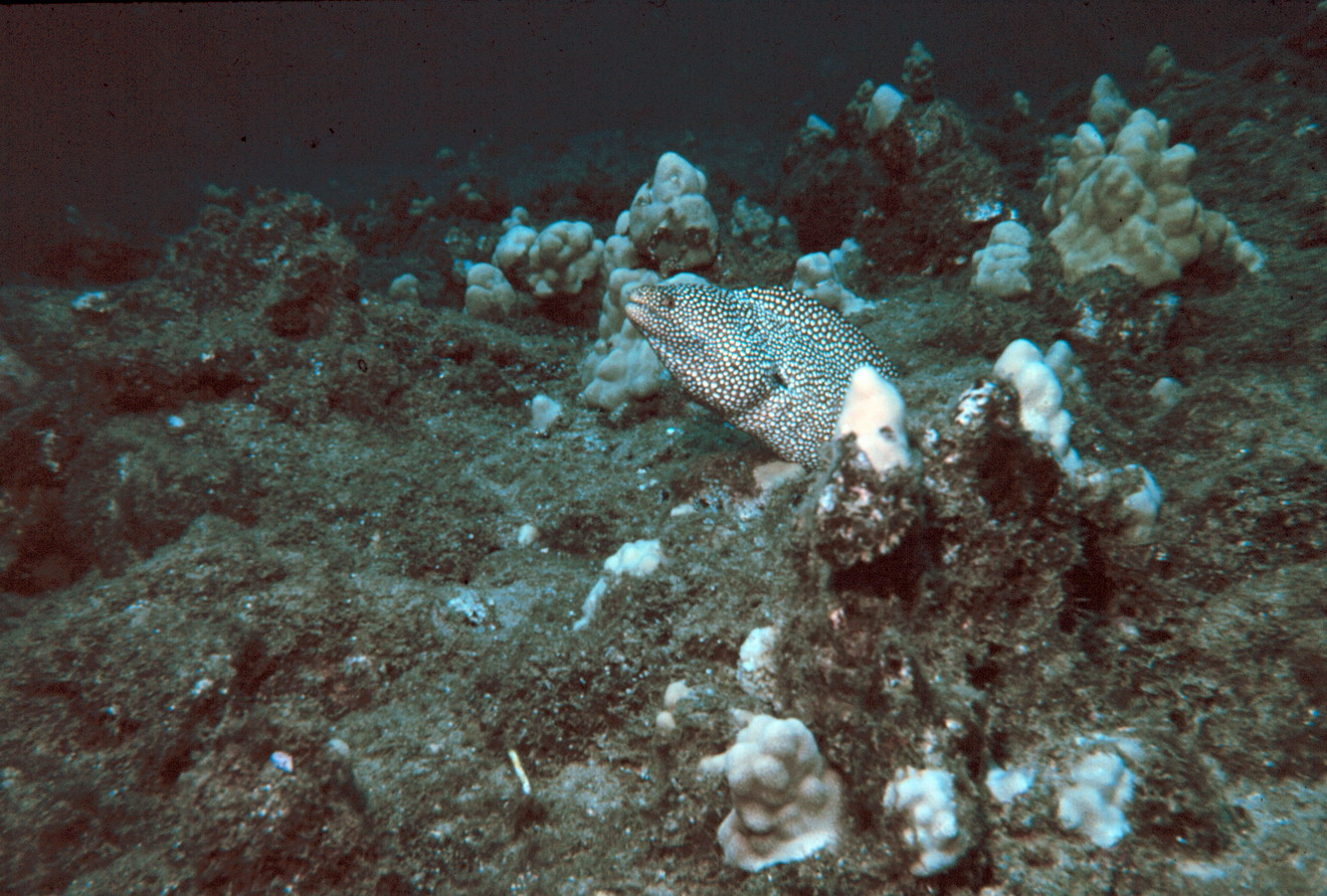 Gymnothorax Meleagris - Turkey Moray eel Porites sp. corals are white outcroppings