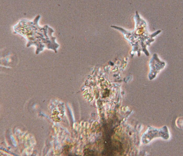 This picture shows a group of amoebae searching for food. Each of them