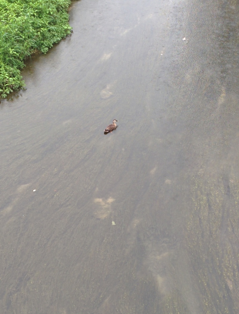 장마비를 맞으며 오리 한마리가 갑천에서 놀고 있다.