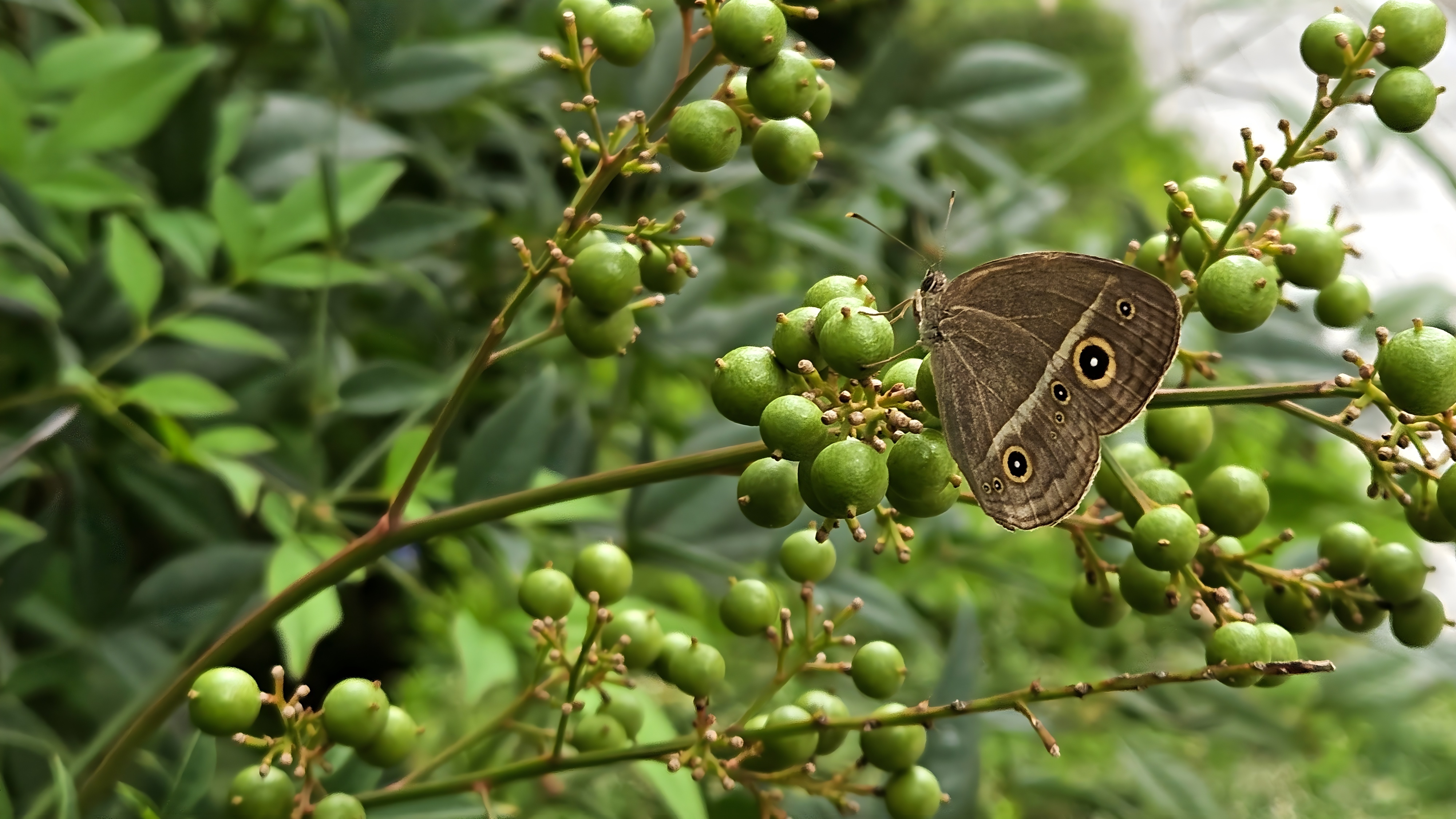 남천 열매에서 쉬는 부처나비 Mycalesis gotama; Image ONLY