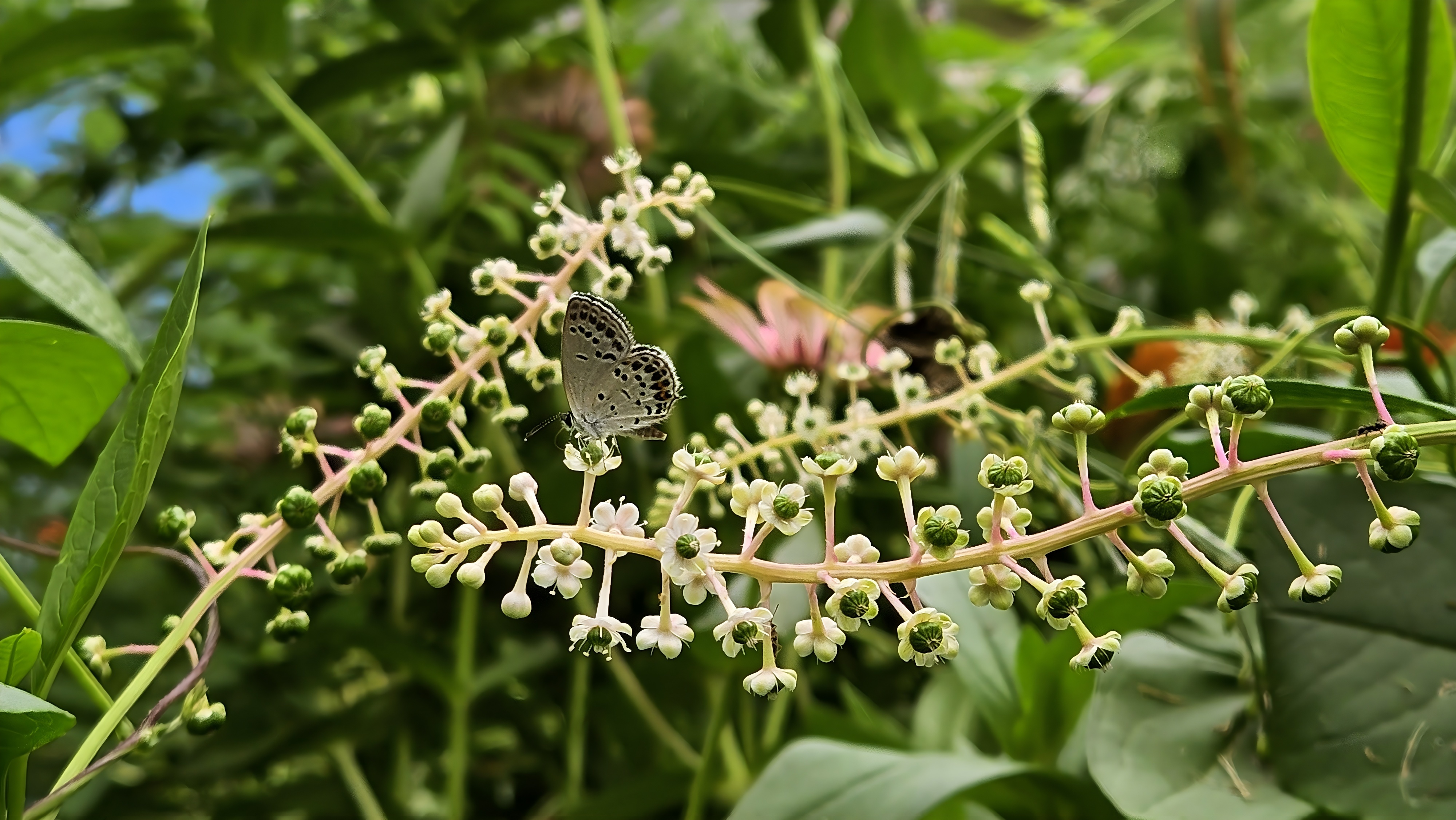 먹부전나비가 열매를 맺기 시작하는 미국자리공 꽃송이에서 꿀을 빨고 있습니다.