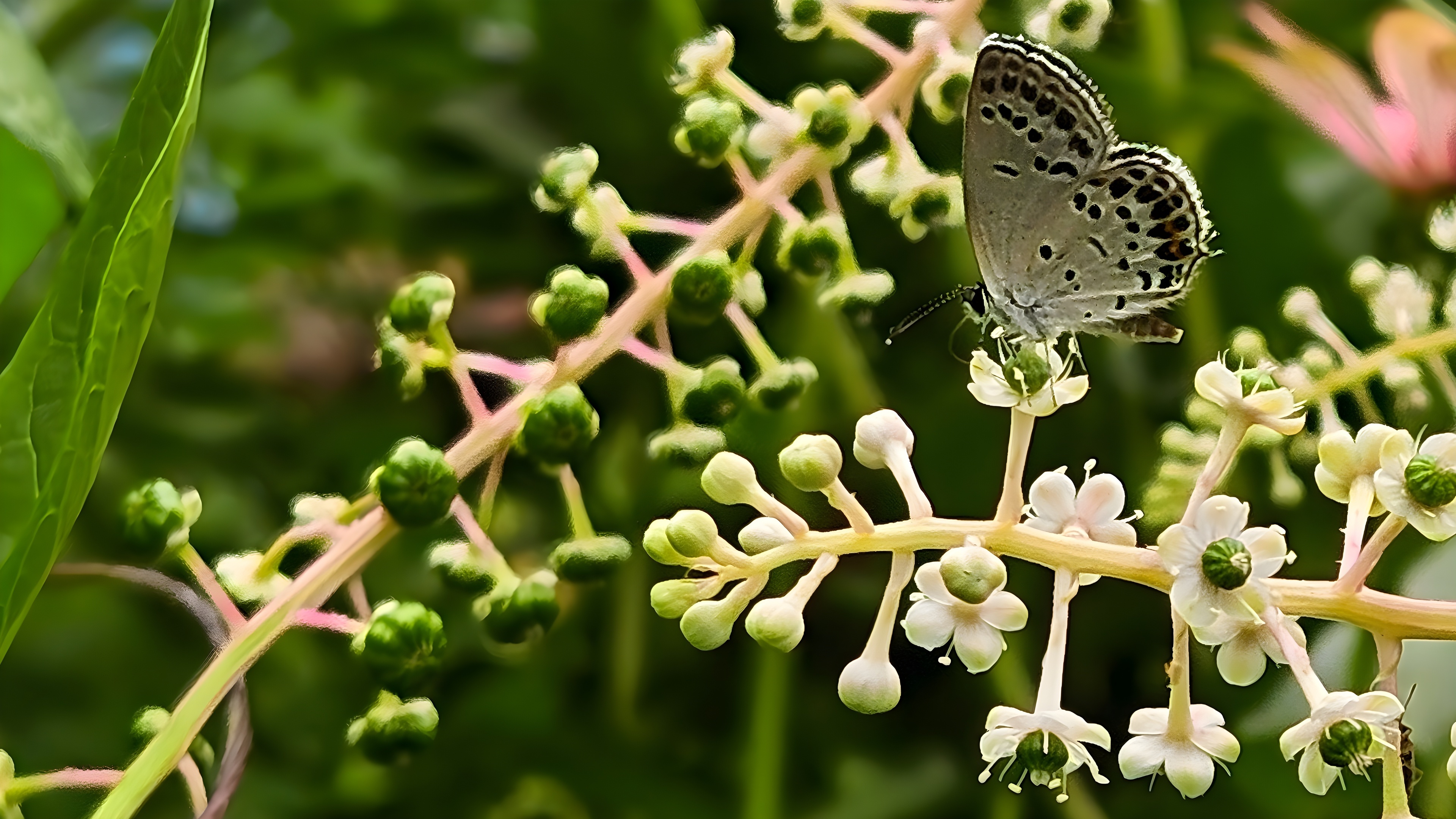 먹부전나비가 열매를 맺기 시작하는 미국자리공 꽃송이에서 꿀을 빨고 있습니다.