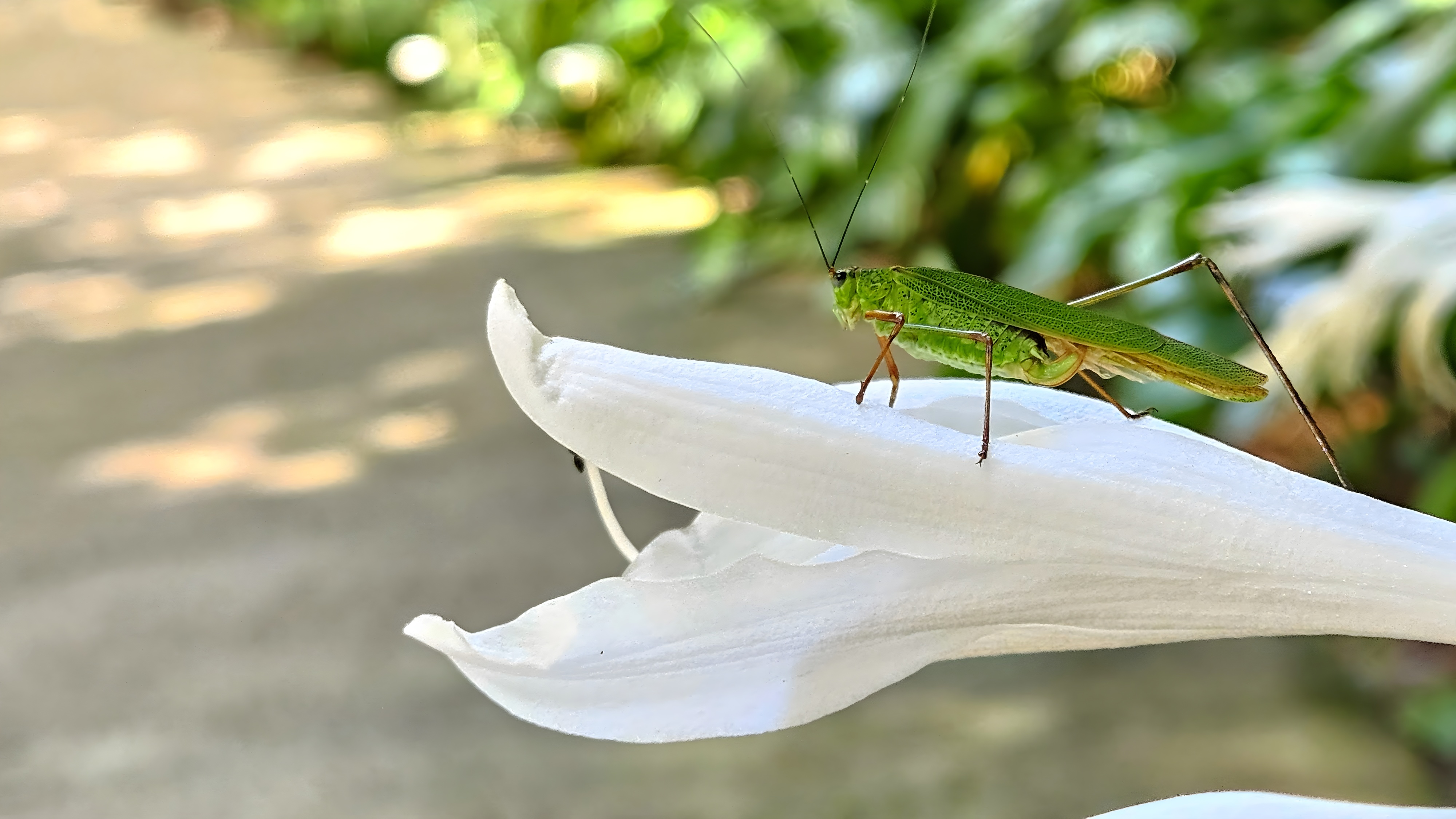 하얀 옥잠화 꽃 위에 베짱이 (검은다리실베짱이) 한 마리가 우아하게 자리를 잡았습니다.