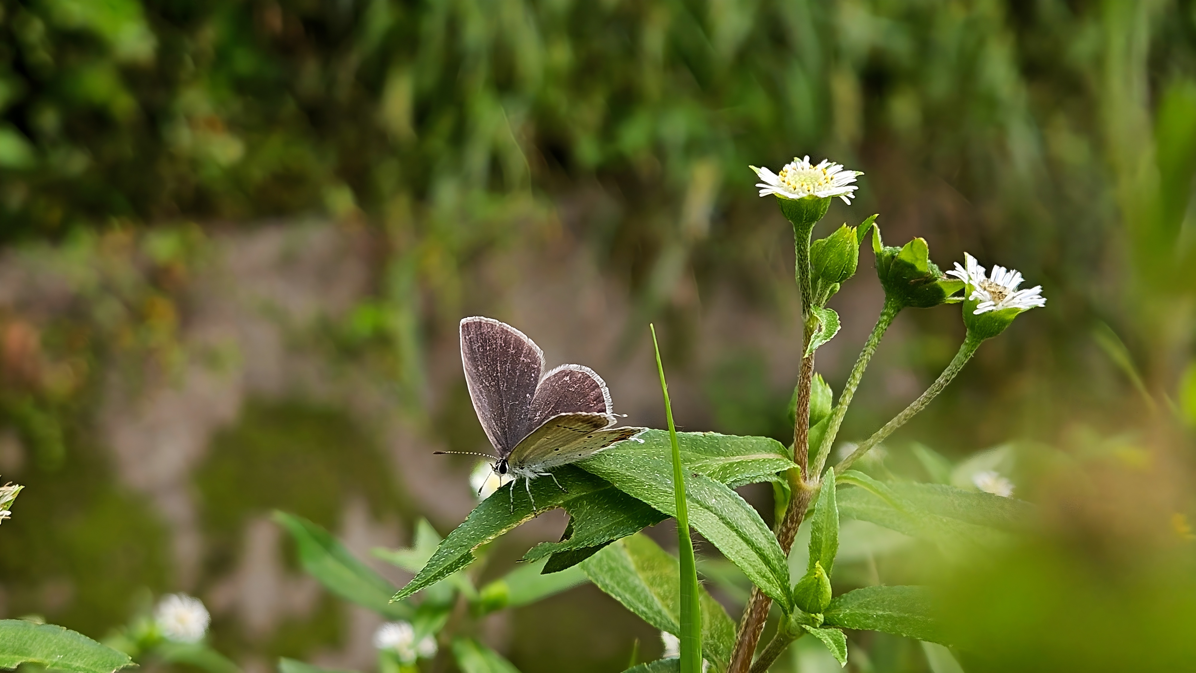 암먹부전나비 한 마리가 한련초 잎에서 쉬고 있습니다.