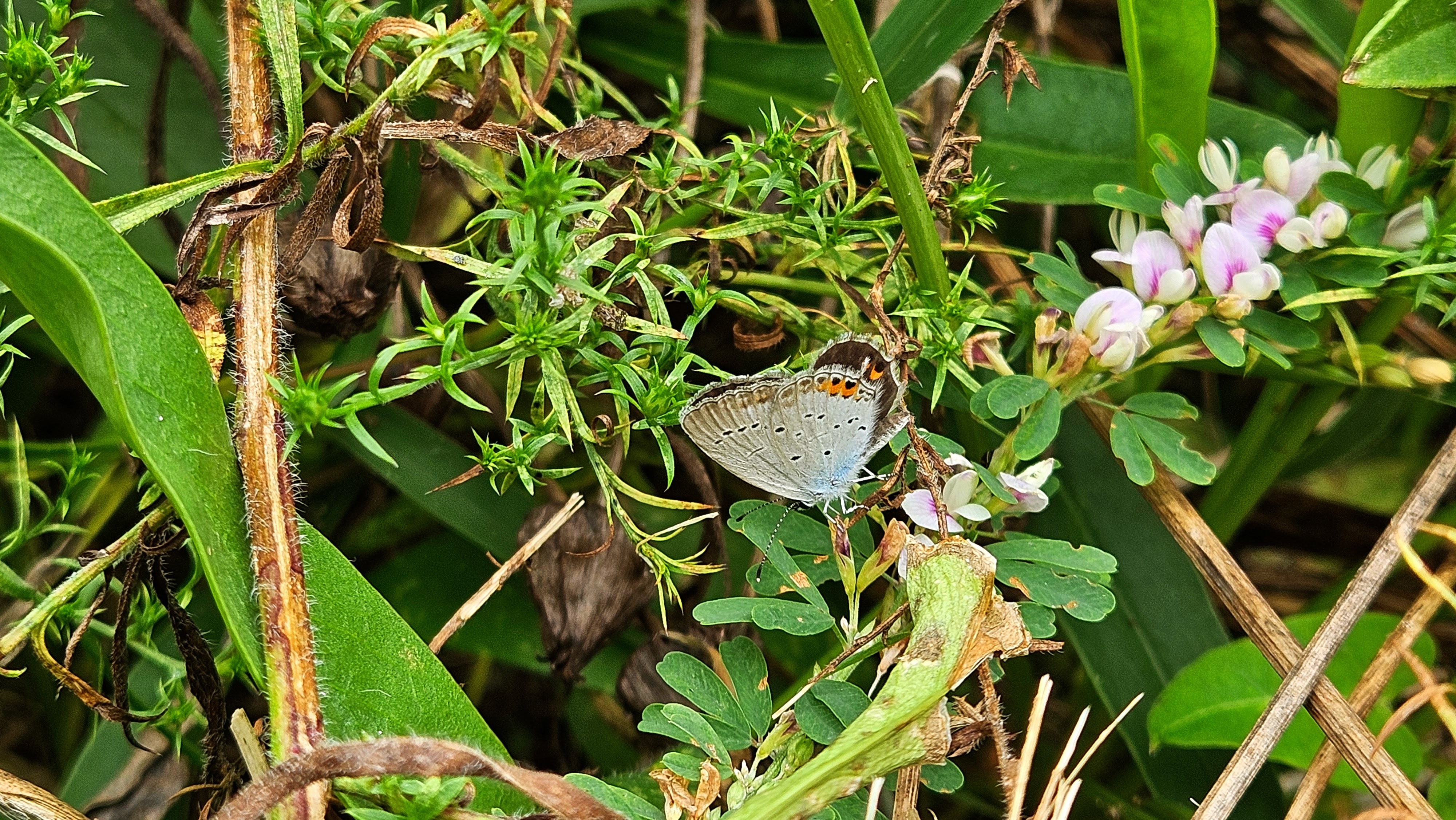 비사리 꽃 옆에 암먹부전나비 한 마리가 쉬고 있습니다.