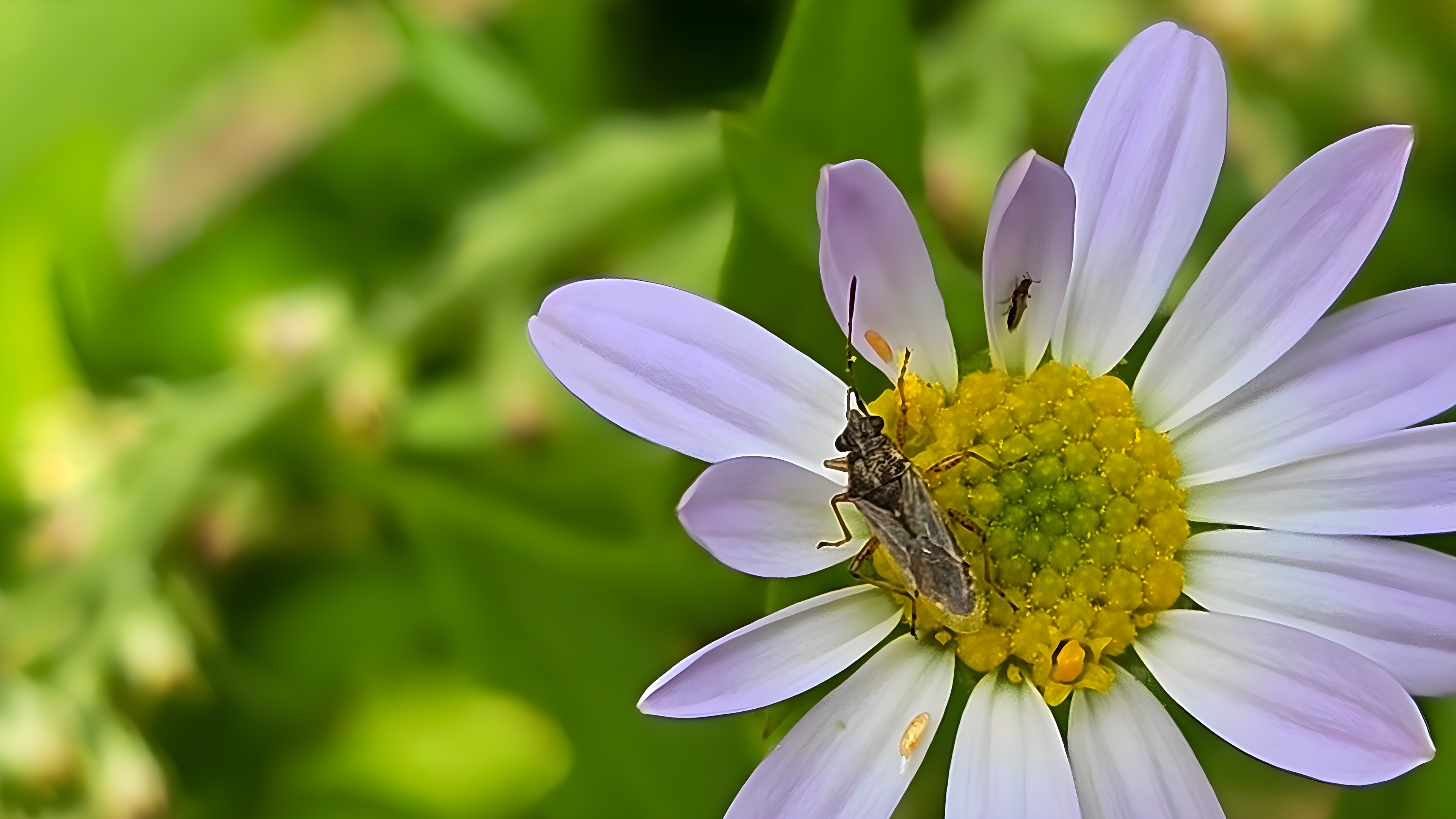 꽃부분을 확대해야만 제대로 보이는 작은 노린재. 그 위에는 더 작은 벌레가 보인다.