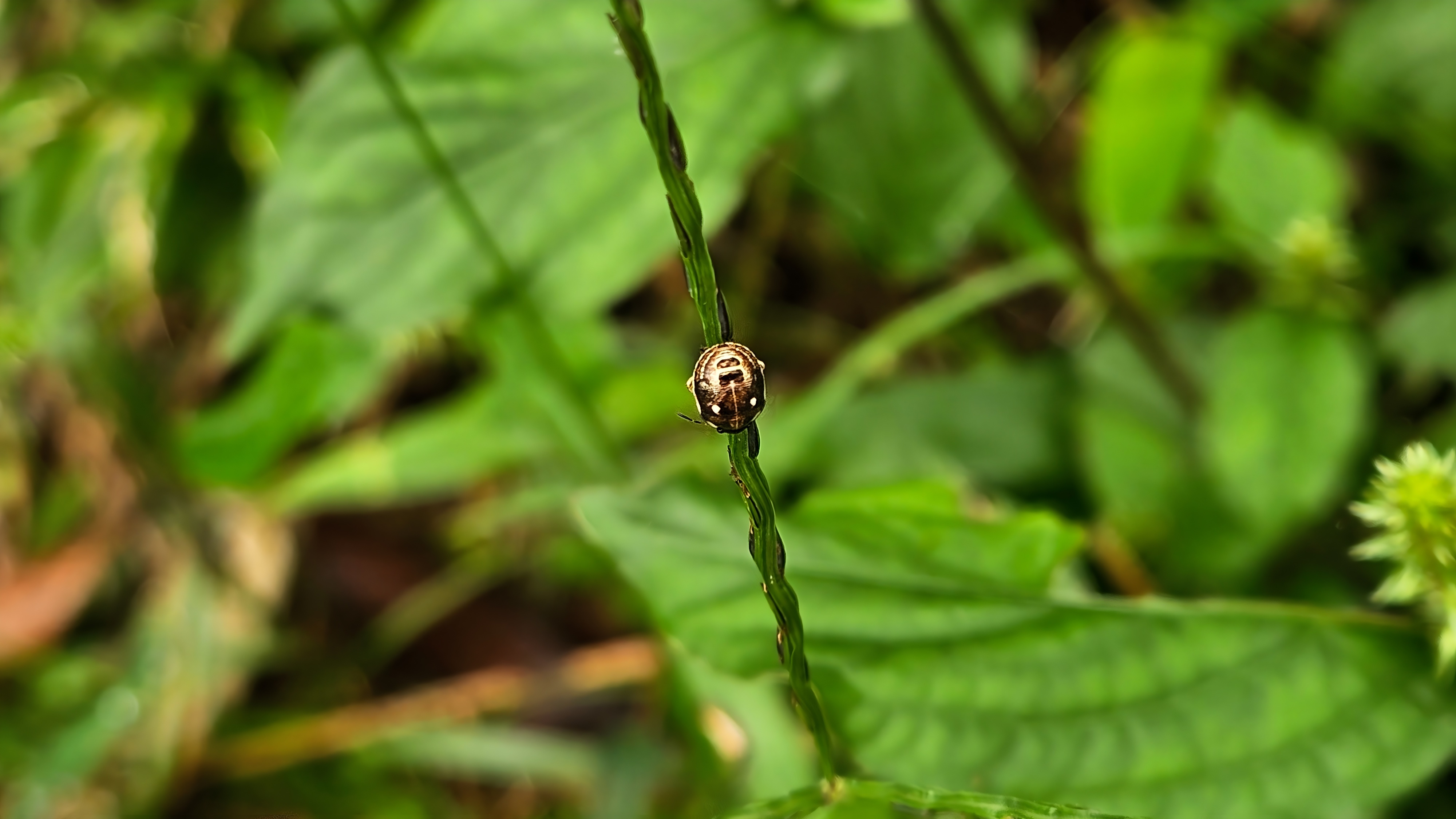 | Description | 풀이삭의 가시점둥글노린재 (Eysarcoris aeneus) 약충 (추정)