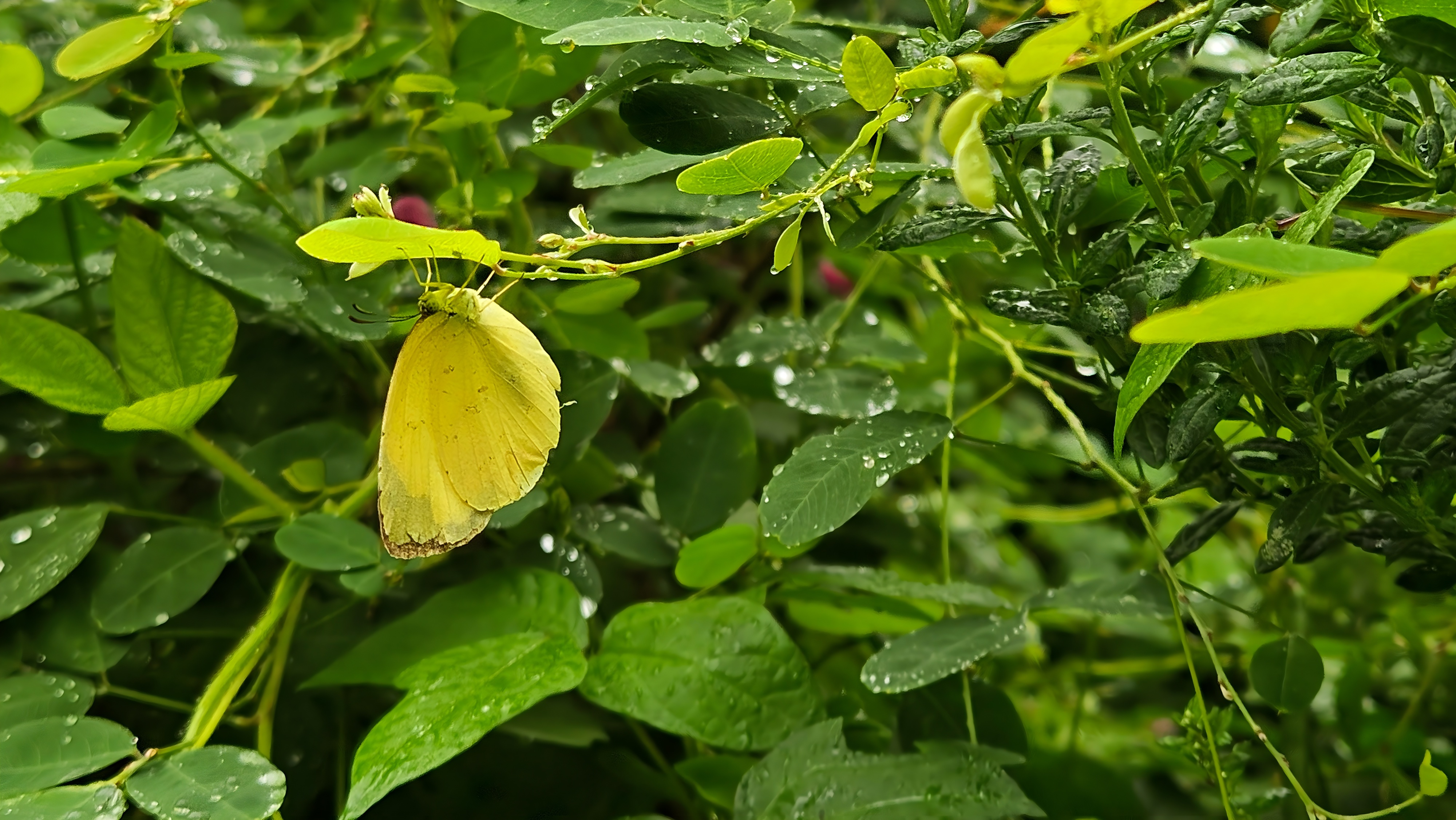 비오는 날, 남방노랑나비가 풀잎에 매다려서 비를 피하고 있습니다.