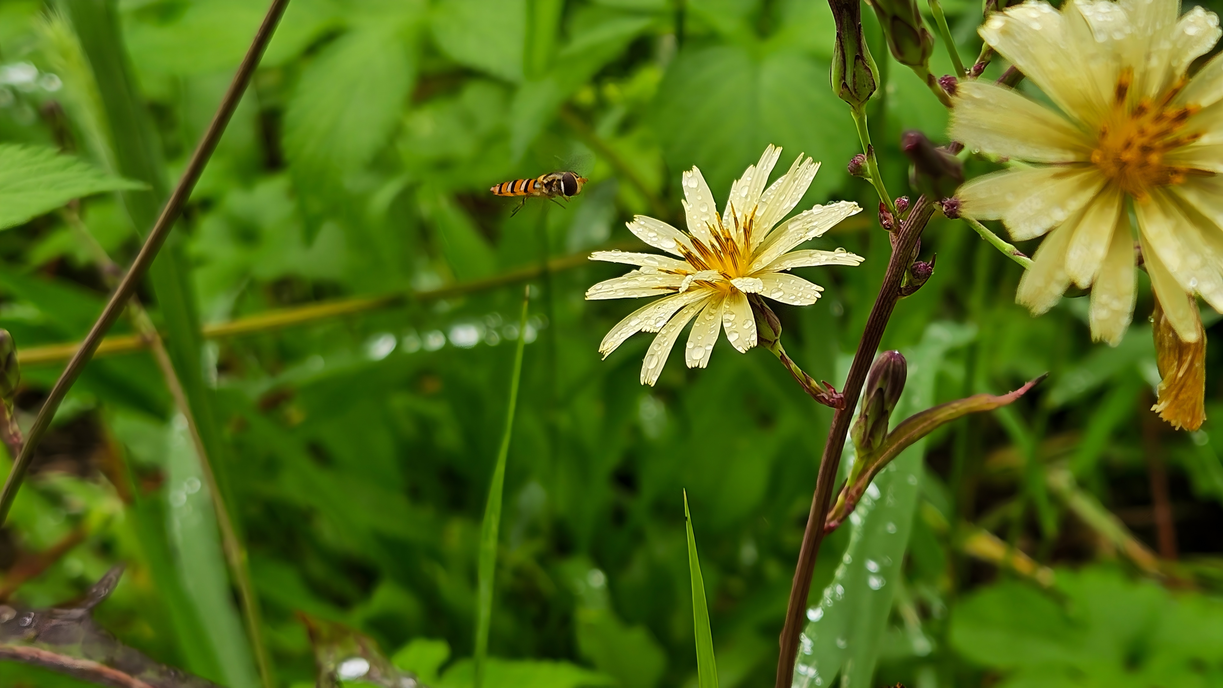 빗속에서도 먹이활동을 하는 호리꽃등에입니다.