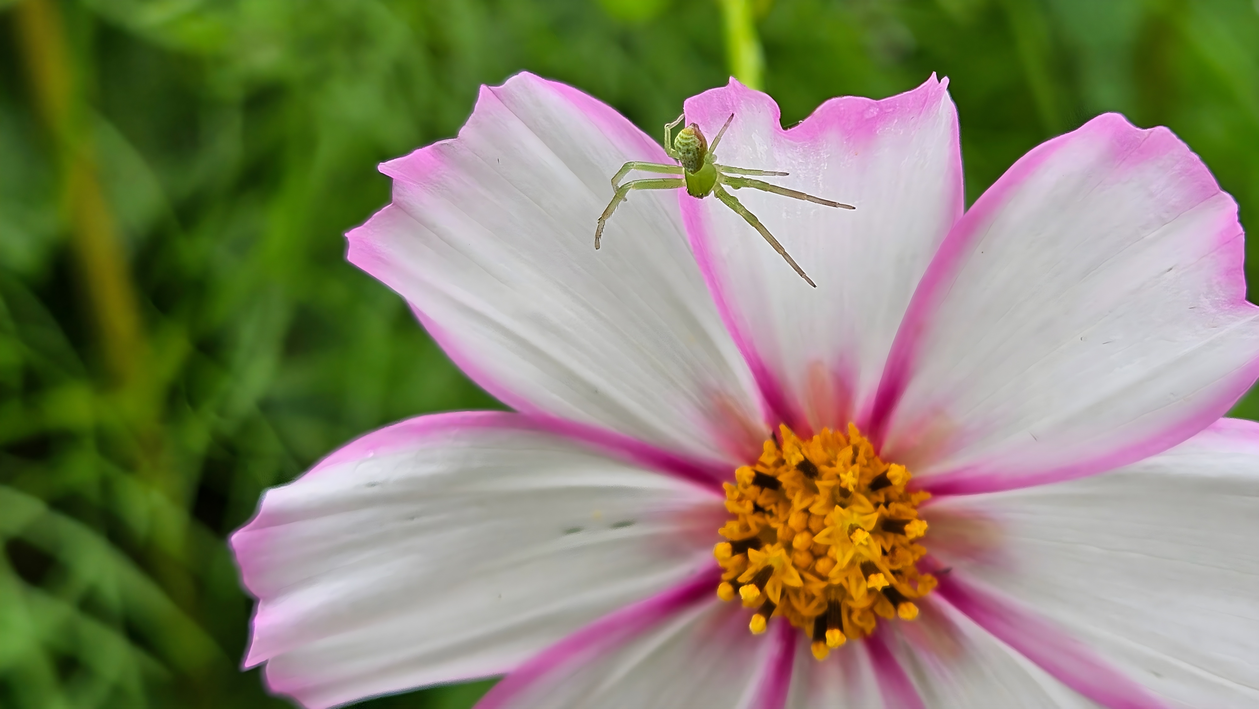 코스모스 꽃잎에 게거미 한 마리가 붙어있습니다.