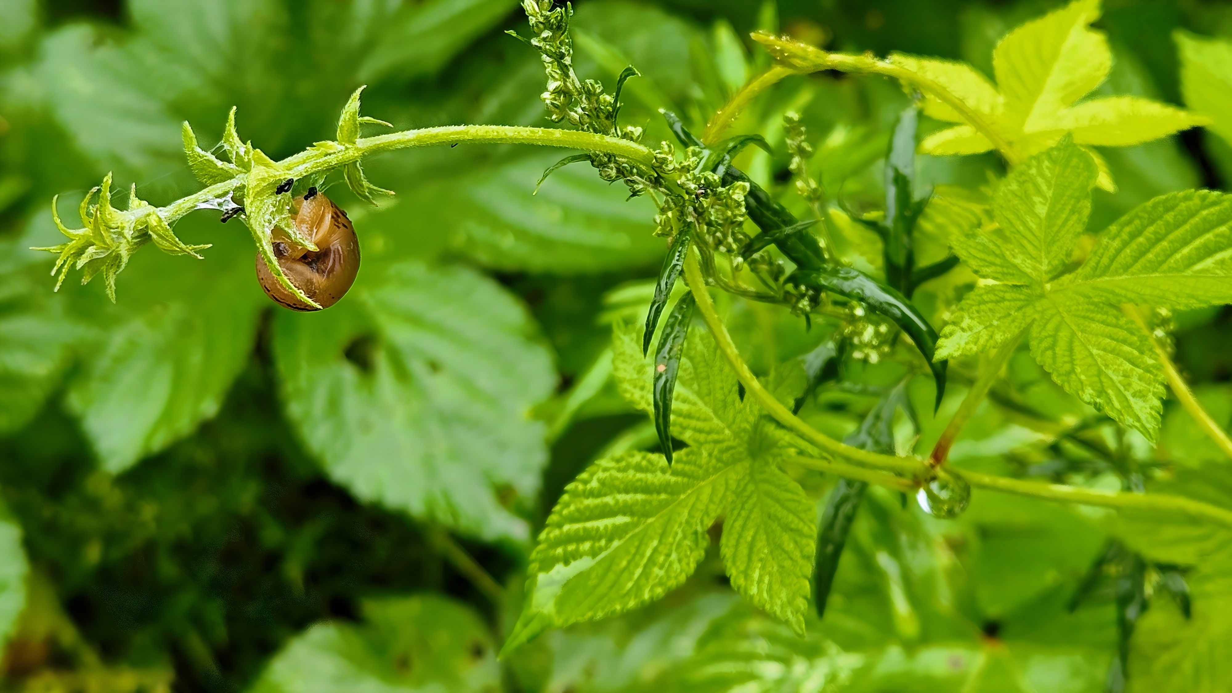 비오는 날 환삼덩굴에서 명주달팽이가 쉬고 있습니다.