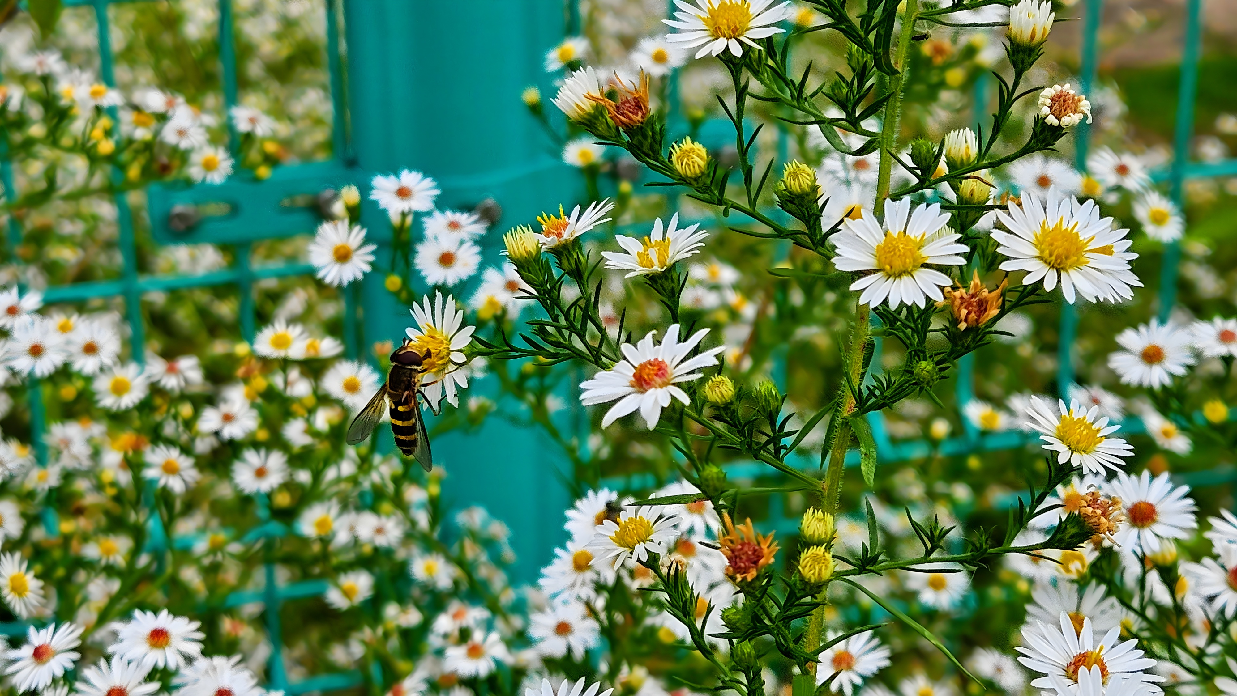 미국쑥부쟁이 꽃을 찾은 물결넓적꽃등에 (Eupeodes nitens) (추정); Image ONLY
