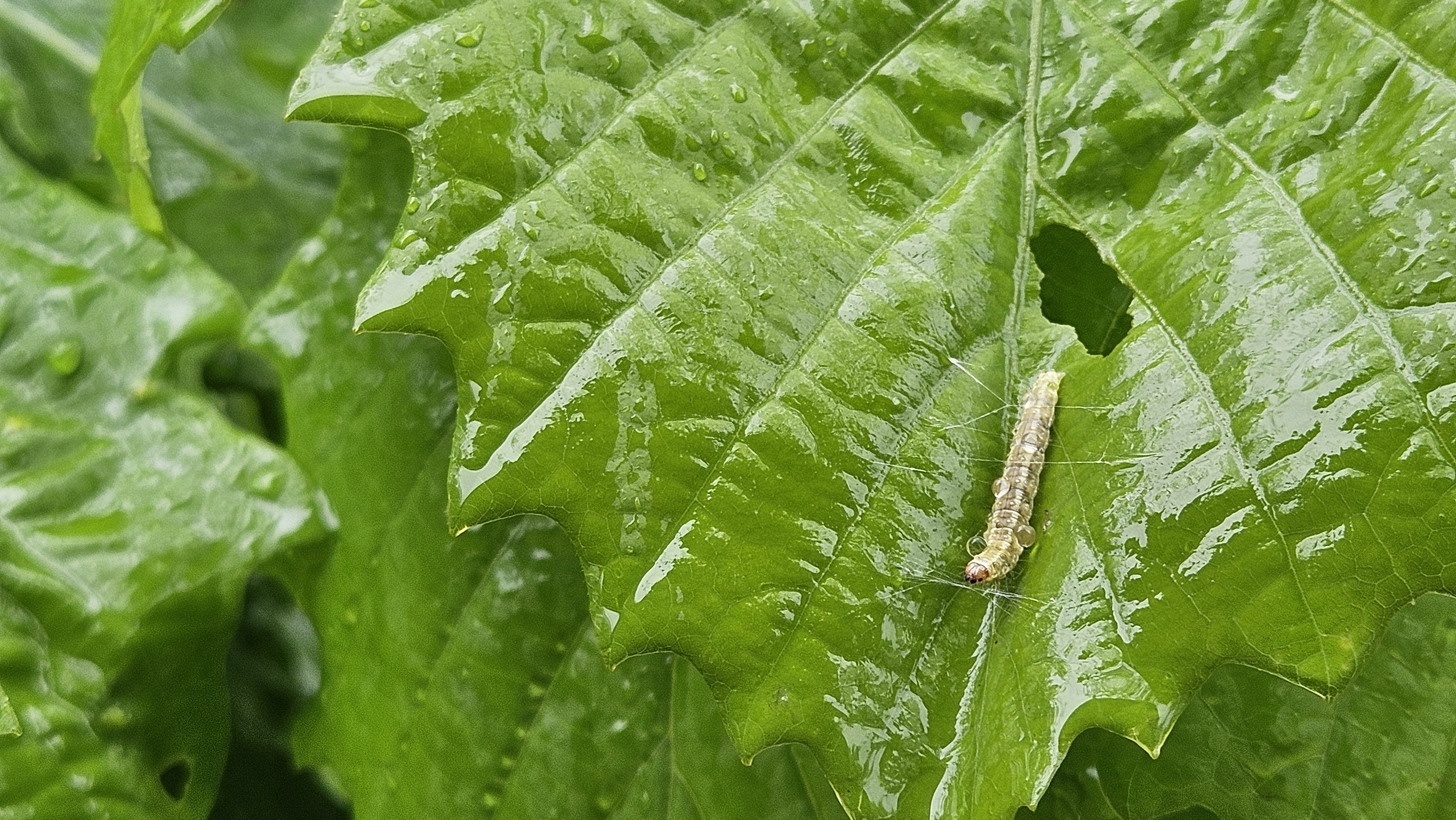 빗속에 고치를 짓는 잎말이나방(추정) 애벌레 비가 제법 쏟아지는 데 비를 맞으며 실을 잣고 있는 애벌레입니다.