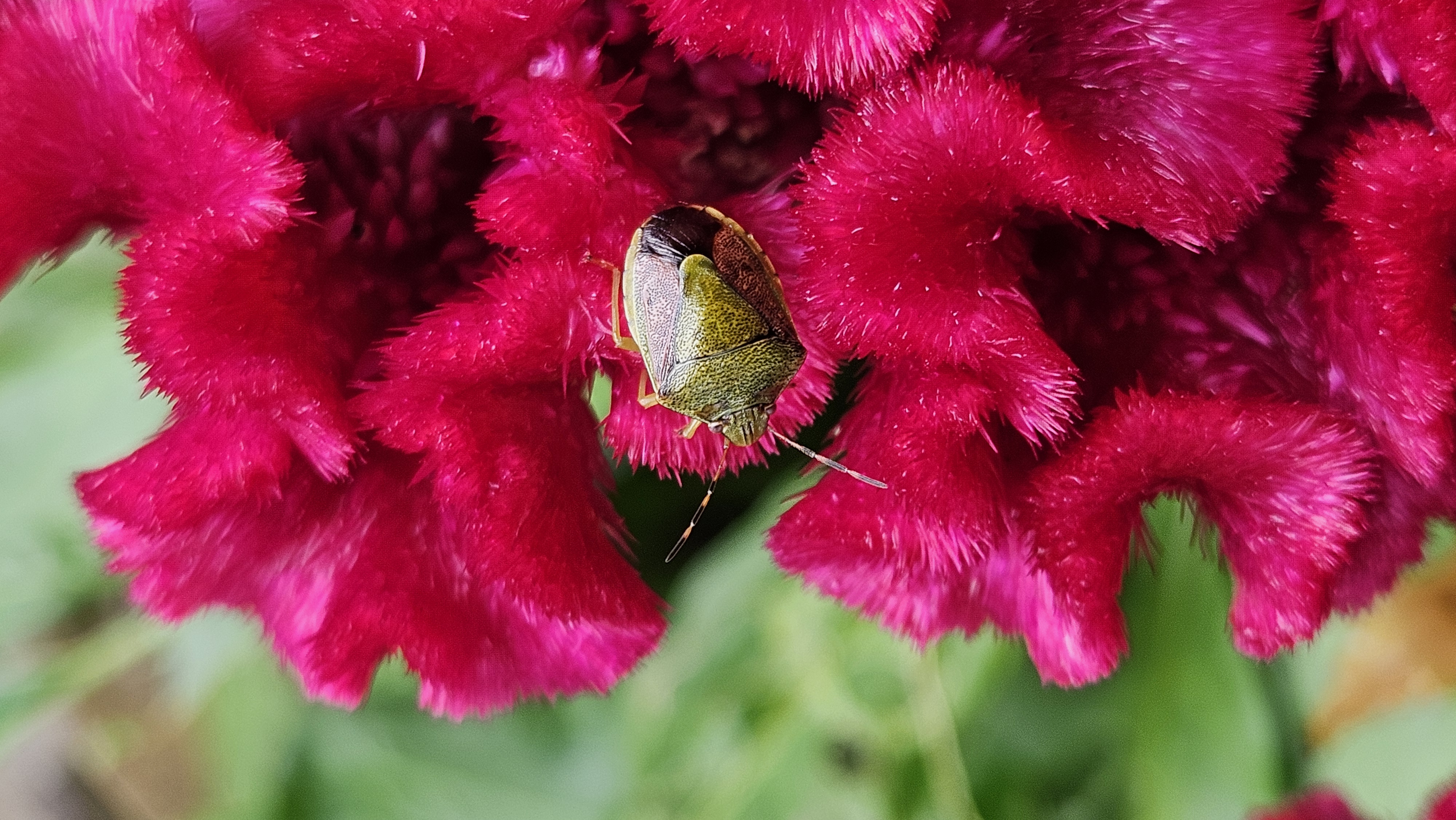 빨간 맨드라미꽃에 갈색날개노린재가 쉬고 있습니다.