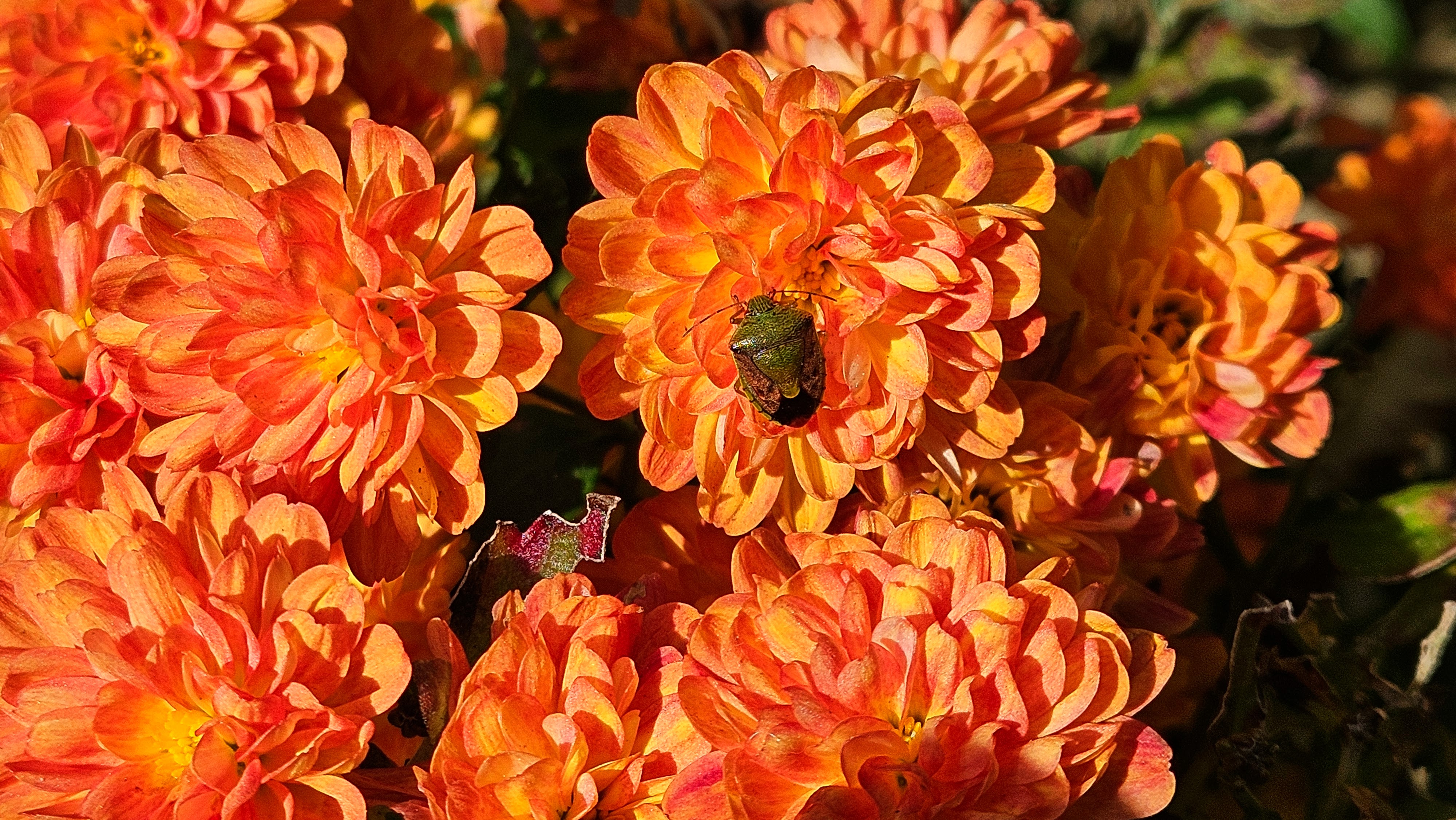 늦가을 국화꽃에서 갈색날개노린재가 쉬고 있습니다.