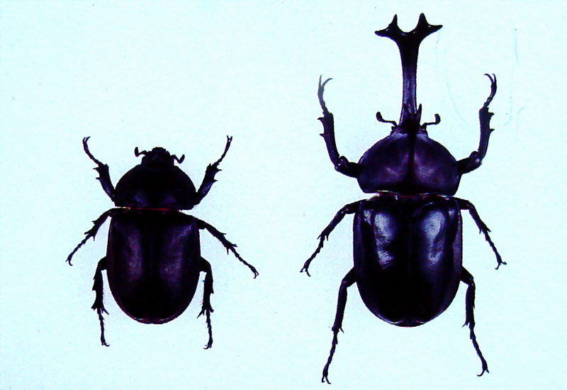 장수풍뎅이 암컷(왼쪽), 수컷(오른쪽) 비교. 암컷에게는 투구와 같은 뿔이 없다.