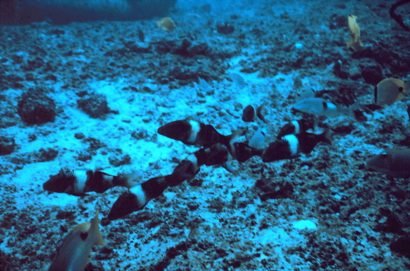 Mixed school of goatfish, Parupeneus multifasciatus, Parapeneus pleurostigma, and Chaetodon miliaris.