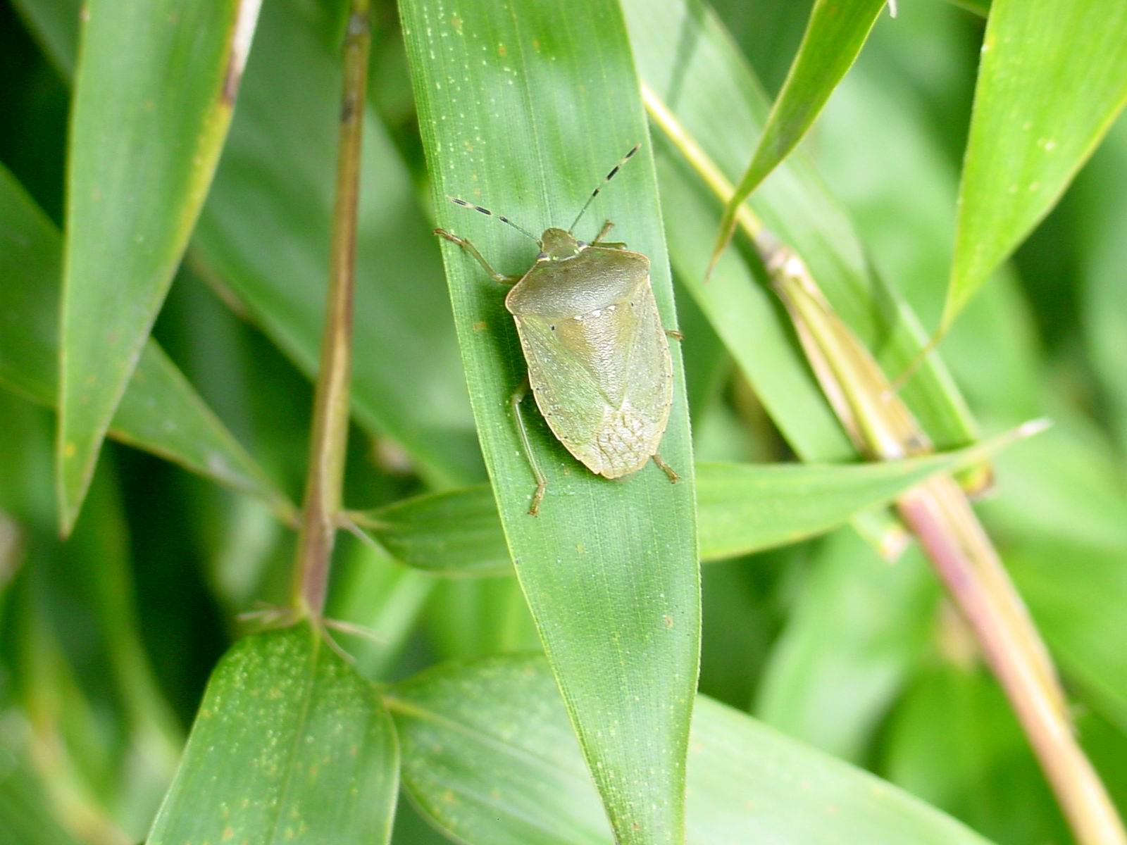 대나무 잎위의 풀색노린재 Nezara antennata (Green Stink Bug) latin dict size=8   common dict size=512