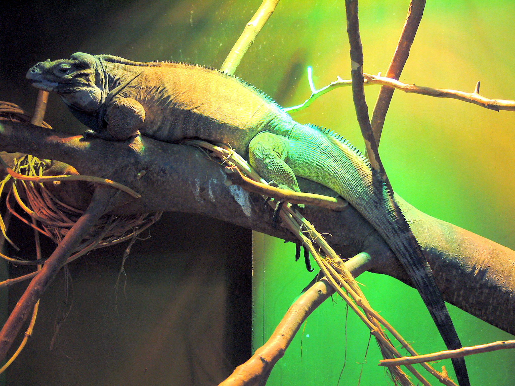 The common name of this massive, heavily built iguana is inspired by the several enlarged, horn-like scales on its snout, resembling the horns of a rhinoceros. These are more prominent in males, and are accompanied in both sexes by two distinctive, round pads of fatty tissue crowning the head. Rough scales cover the body, which is uniformly greyish-brown, olive-green, or even black in colour, lacking the bright colours that adorn several other iguana species. This sombre colouration helps camouflage the animal against the rocks and scrub of its habitat. |
