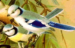 [Photo] Azure Tit from 1905 German enc. The lower bird is the hybrid with the Blue Tit which was once considered to be a distinct species, "Pleske's Tit"