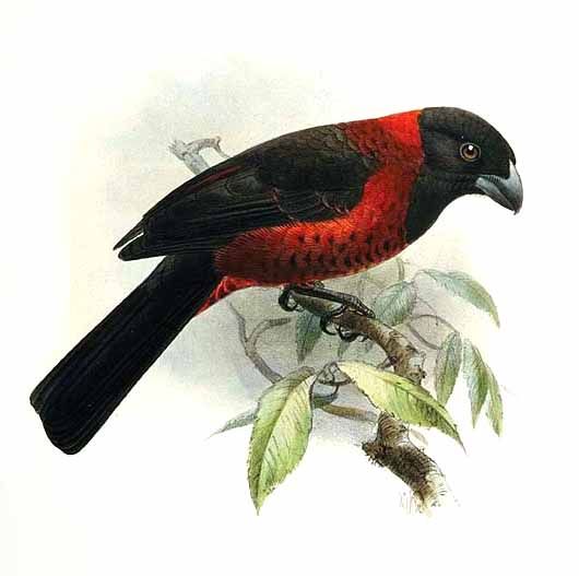 [Photo] Crimson-collared Grosbeak - Rhodothraupis celaeno - Cardinal ?? collier. Author: John Gerrard Keulemans (1842-1912). Source: www.oiseaux.net/photos/john.gerrard.keulemans/crimson-collared.grosbeak.1.html