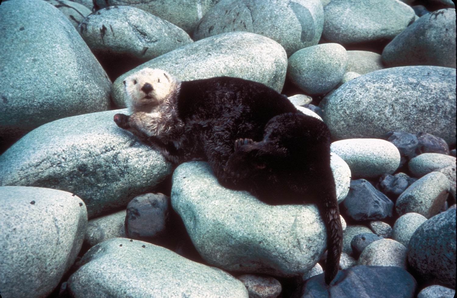 Sea Otter (Enhydra lutris){!--해달/바다수달--> on large pebbles From the U.S. Fish and Wildlife Service's online digital media library .