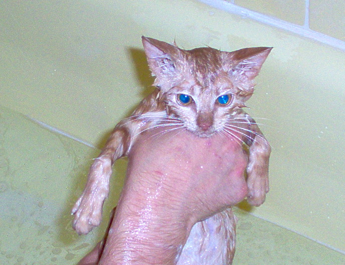 Chico's first bath. Looks more like "Gizmo!" | |