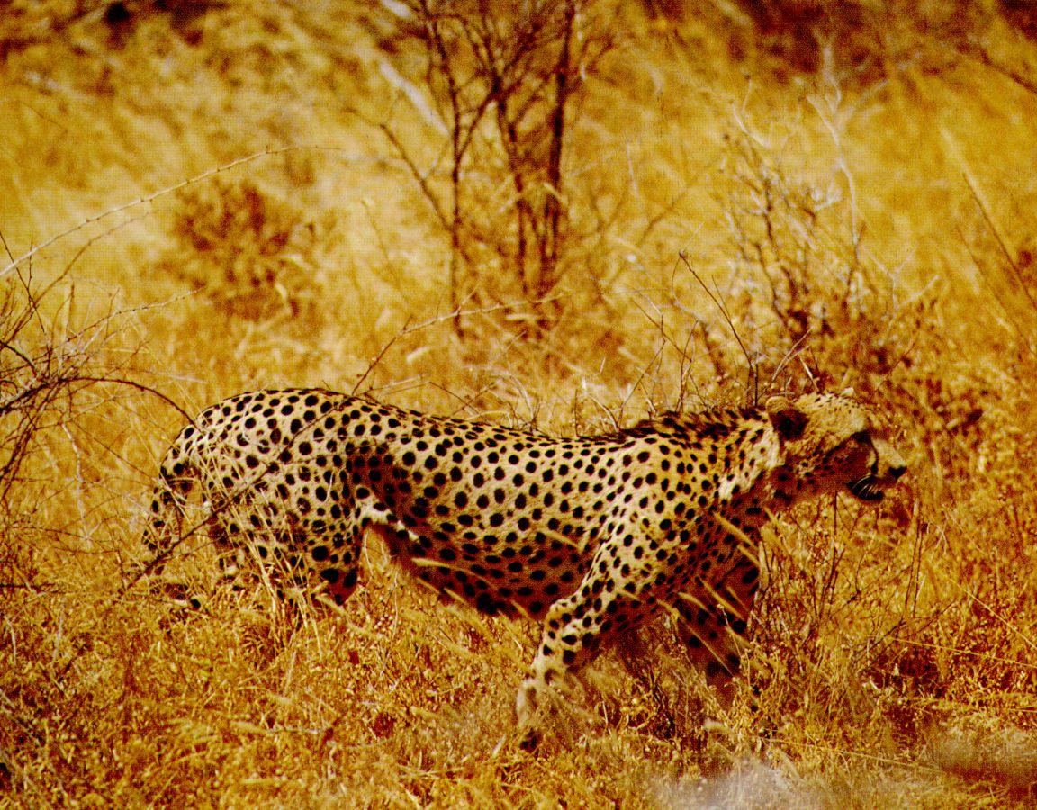 WC.cheetah1.jpg: Cheetah stalking though yellow grass. 1152x900