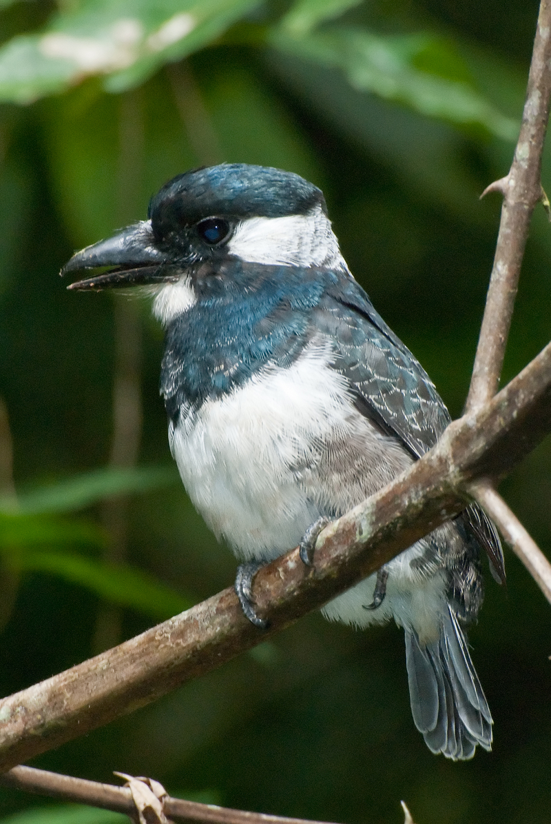 The Black-breasted Puffbird occurs from Panama’s Canal Zone in the north, to northwest Ecuador in the south. It is a relatively large, strikingly plumaged, but entirely black-and-white puffbird. Much of its range is shared with substantially smaller, but often more numerous Pied Puffbird (Notharchus tectus), which is also mainly black and white. However, the latter species has a much narrower black breast band, no white on the hindneck, a small amount of white on the back, and a much smaller bill. Especially with previous experience, there should be no real risk of confusion. The Black-breasted Puffbird prefers humid lowland forest below 1000 m, where it is usually spotted in pairs, typically keeping to the canopy, although in some areas it commonly follows army ant swarms, which brings it much lower above the ground. |