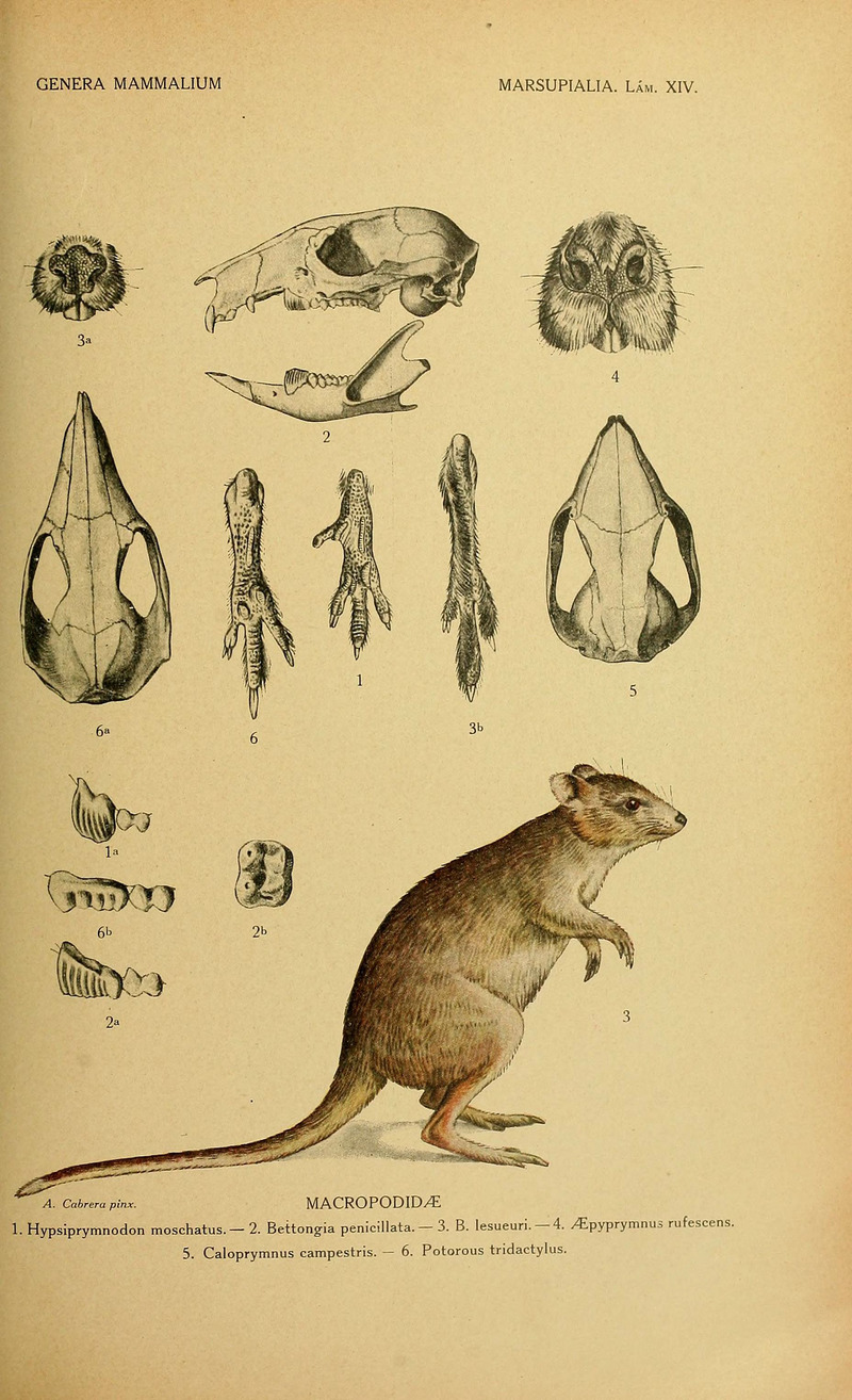 1. Hypsiprymnodon moschatus.- 2. Bettongia penicillata. - 3. B. lesueuri.-4. ^pyprymnus rufescens 5. Caloprymnus campestris. — 6. Potorous tridactylus.