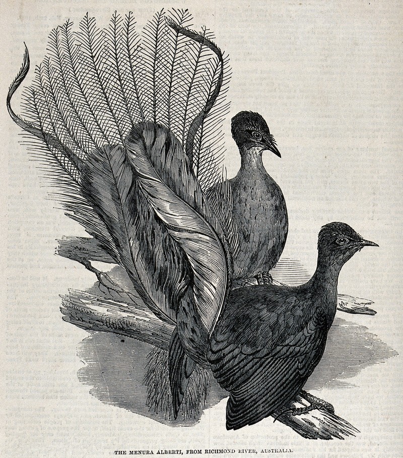 Source: https://commons.wikimedia.org/wiki/File:Two_Lyre_birds,_or_Menura_Alberti_birds,_perching_on_a_branc_Wellcome_V0022317.jpg