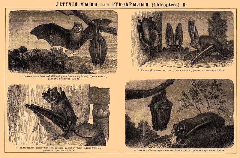 greater horseshoe bat (Rhinolophus ferrumequinum), common long-eared bat (Plecotus auritus), greater mouse-tailed bat (Rhinopoma microphyllum), common noctule (Nyctalus noctula) Description