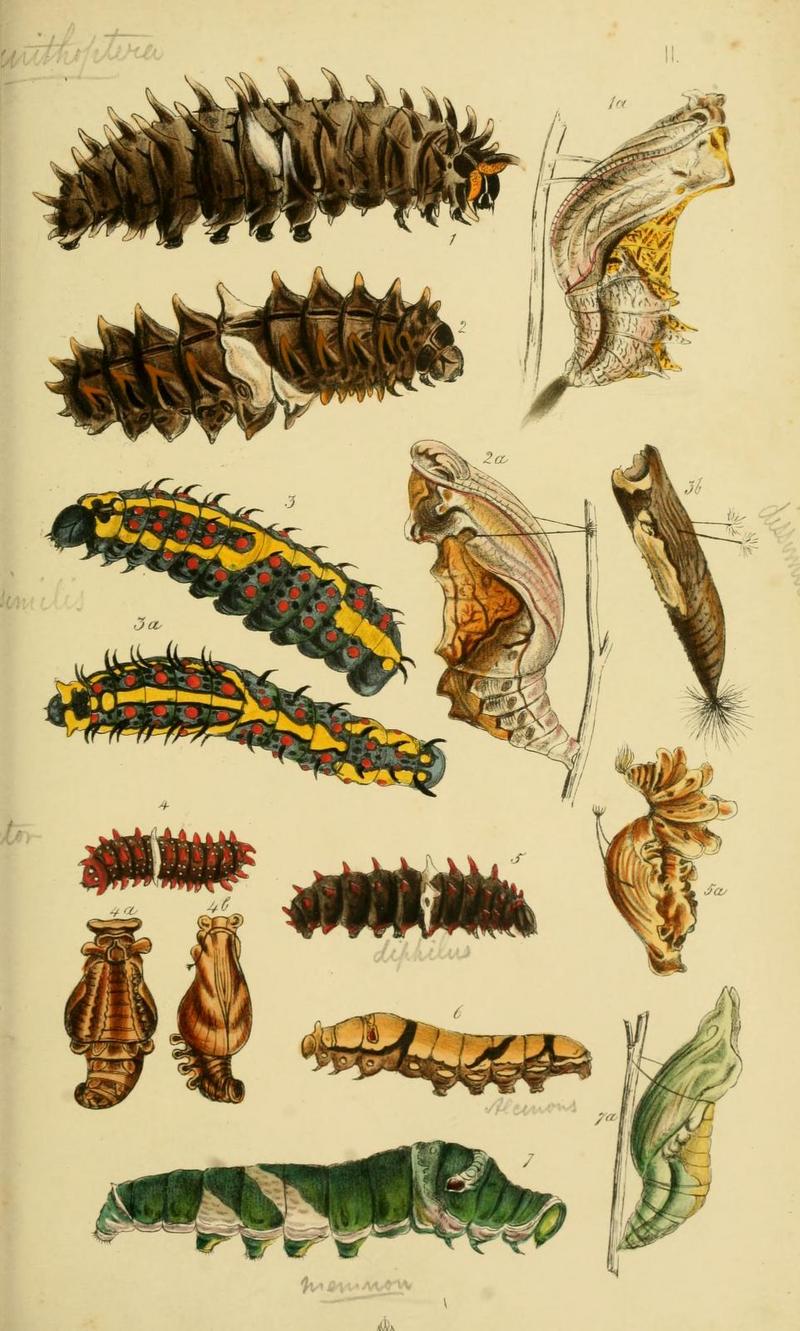 Butterfly caterpillars: common birdwing (Troides helena), Sri Lankan birdwing (Troides darsius), common mime (Papilio clytia), crimson rose (Pachliopta hector), common rose (Pachliopta aristolochiae), Chinese windmill (Byasa alcinous), great Mormon (Papilio memnon) Thomas Horsfield and Frederic Moore. A catalogue of the lepidopterous insects in the Museum of the Hon. East-India Company. Alternative Title:Catalogue of the lepidopterous insects in the Museum of Natural History at the East-India House. Multiple dates 1857 - 1859; 1857-1859. Plate II text