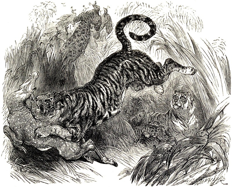 tiger (Panthera tigris) Drawing/wood engraving of a tiger attacking a deer with another tiger (apparently a mother with cubs) stretched out on the ground watching. In the background, several peacocks escape the scene by flight.