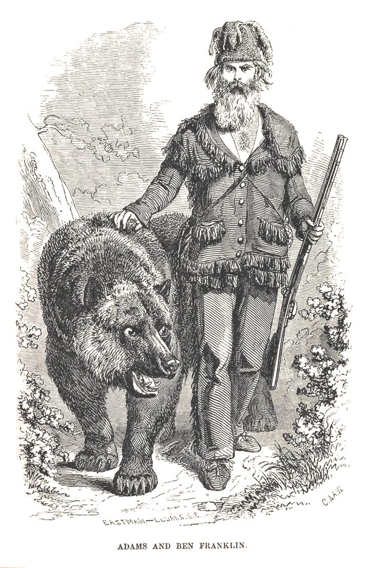 California grizzly bear (Ursus arctos californicus) "Grizzly" Adams, American hunter. Figure from Hittell, T. H., "The adventures of James Capen Adams, mountaineer and grizzly bear hunter, of California", San Francisco : Towne & Bacon, 1860, opp. p. 186. He is shown with a bear named Benjamin Franklin. The copyright has long since expired on this illustration.