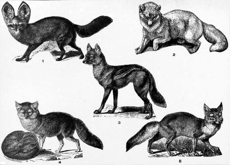 Foxes: Cape fox (Vulpes chama), Arctic fox (Vulpes lagopus), side-striped jackal (Canis adustus), silver fox or red fox (Vulpes vulpes), corsac fox (Vulpes corsac) Drawing of five species of foxes