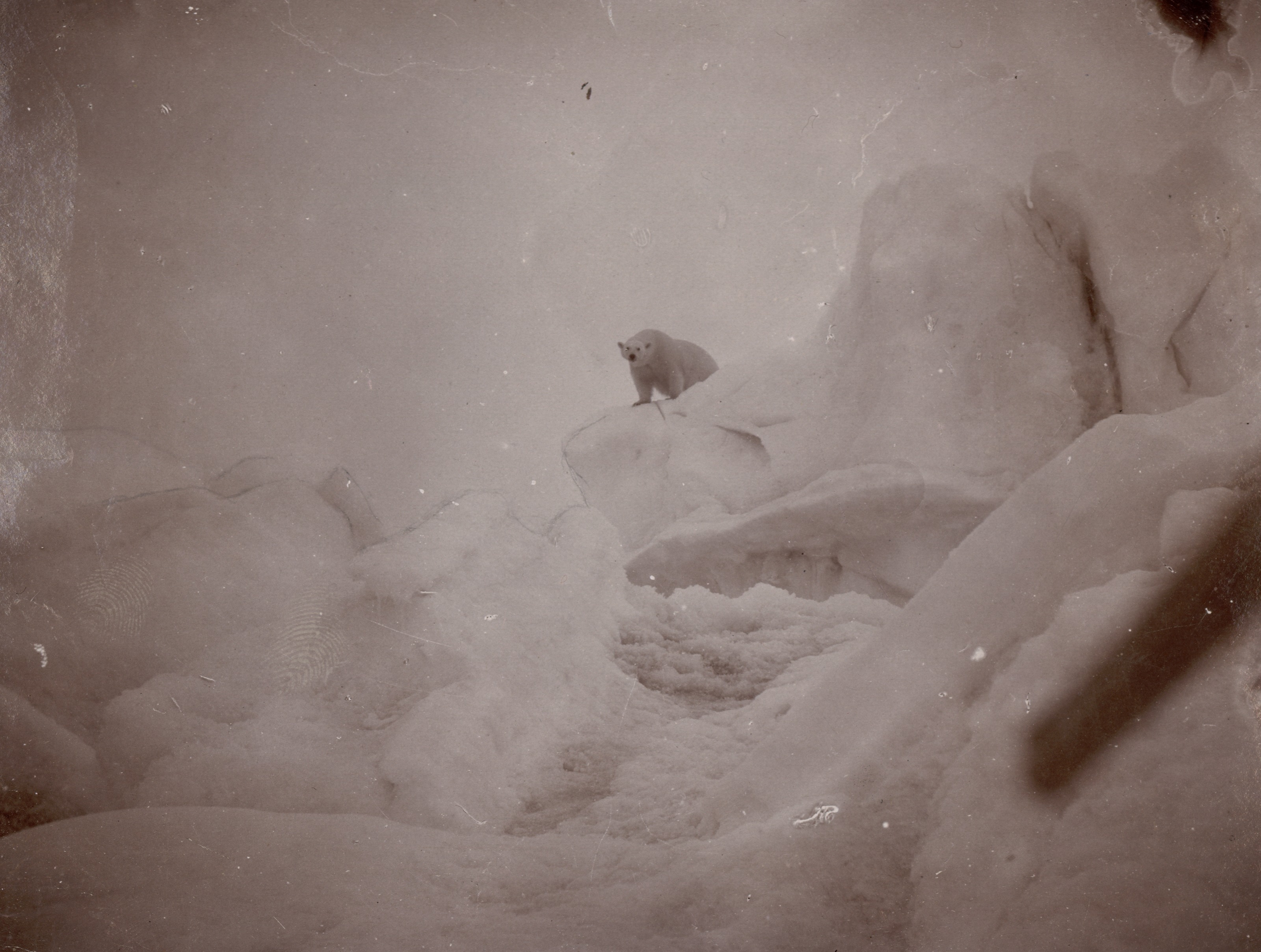 Deutsch: Während der Eisbärenjagd mit Jackson. Der Eisbär ist draussen auf den Eisbergen. Der dunkle Schatten rechts ist das Gewehr. Eines der Bilder von der Expedition mit dem Polarschiff zum Nordpol in der Zeit 24. Juni 1893 bis 13. August 1896. Nach dem Plan sollte das Schiff im Eis mit den Meeresströmungen von der sibirischen Küsten über den Nordpol nach Grönland treiben. Im März 1895 unternahm Fridtjof Nansen zusammen mit einem Begleiter einen abenteuerlichen Skimarsch mit Hundeschlitten in einem Versuch zum Polpunkt zu kommen.