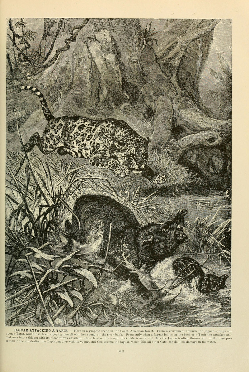 jaguar (Panthera onca), South American tapir (Tapirus terrestris) JAGUAR ATTACKING A TAPIR. Here is a graphic scene in the South American forest. From a convenient ambush the Jaguar springs out upon a Tapir, which has been enjoying herself with her young on the river bank. Frequently when a Jaguar jumps on the back of a Tapir the attacked animal runs into a thicket with its bloodthirsty assailant, whose hold on the tough, thick hide is weak, and thus the Jaguar is often thrown off. In the case presented in the illustration the Tapir can dive with its young, and thus escape the Jaguar, which, like all other Cats, can do little damage in the water. (125)