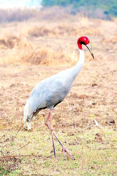 Sarus crane (Grus antigone) Sarus cranes are considered the tallest of flying birds with a standing height of 1.8 m (5.9 feet). They can have a wingspan of 2.5 m and can weigh anywhere from 5 to 12 kg. These cranes have a very light gray colouration throughout their trunk with darker gray patches near the tips of their wings. The most prominent feature, however, is the bright red colouration on the head and top of the neck. The very top of the head has a white patch as well as a small white spot behind the eye. The beak tends to be white to light grey in colour, and the long legs have a pale red colouration. Males and females do not differ in their coloration, but males are typically larger than females. Adults and juveniles can be distinguished by their crown colour, that is, the colouration of the head. Juveniles (less than four months of age) have a solid “dull brick red” colour while adults have a “dark red colour with a bald patch on top.”