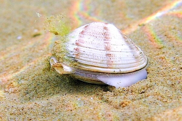 The striped venus clam can be found all around the British Isles except for southeast England, buried in the sediment on the lower shore to depths of about 5cm. It has a cream-coloured shell with concentric ridges and radiating red-brown stripes running from the hinge to outer edge. These clams use their siphons to filter plankton from the water. The striped venus clam has separate sexes and releases gametes into the water, which develop into the veliger larvae. These go through a planktonic phase before taking on the adult form. | |