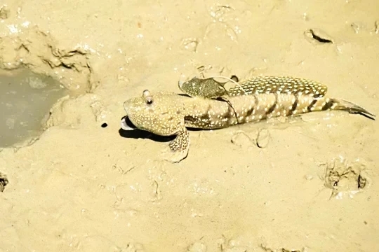Blue-spotted mudskipper (Boleophthalmus boddarti) Mudskippers rank amongst the most fascinating of intertidal life of mangrove and mudflat habitats. The blue-spotted mudskipper Boleophthalmus boddarti is amongst the most conspicuous of its kind and, if present, is easily seen at low tide when active on exposed mudflats. At high tide they remain in their burrows, hidden from sight.