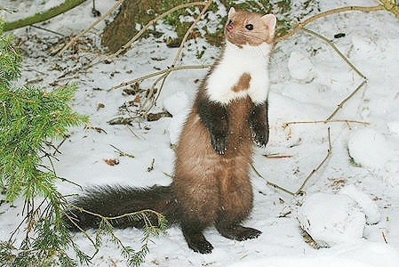 The forked white throat-patch of the stone marten is a distinctive feature. Like all its kind it is a nimble climber, able to scale smooth tree trunks and walls, and it also slip through the narrowest of gaps in search of food. It is a notorious raider of henhouses. | |