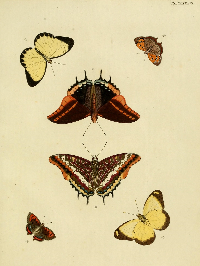 two-tailed pasha (Charaxes jasius), western yellow caper white (Belenois hedyle), small copper butterfly (Lycaena phlaeas) Plate CLXXXVI