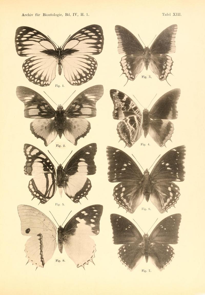 Crossley's forest queen (Euxanthe crossleyi), Charaxes acraeoides, two-tailed pasha (Charaxes jasius), Eudoxus charaxes (Charaxes eudoxus mechowi), noble white charaxes (Charaxes nobilis), Charaxes mixtus, two-spot blue charaxes (Charaxes bipunctatus), Hadrian's white charaxes (Charaxes hadrianus) Arnold Schultze, 1917 Die charaxiden und apaturiden der kolonie Kamerun : eine zoogeographische und biologische studie / von Arnold Schultze. Mit tafel IX-XIV, 1 karte und 2 textfiguren.Berlin,Gesellschaft Naturforschender Freunde zu Berlin,1916