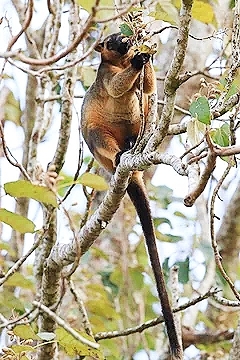 Bennett's tree kangaroo is the larger of the Australian tree kangaroos with mature males reaching close to 14 kg and females nearly 11 kg. The overall colouration is dark brown and the ears are rounded. The arboreal habit clearly differentiates the species from other ground-dwelling macropods. | |