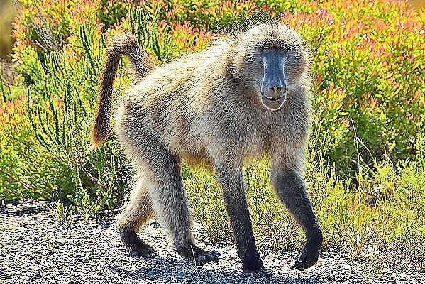 The chacma baboon is a large primate with a dog-like face and large, prominent canines. A mature male measures 1.5 m from head to tail and weighs up to 33 kg, whereas the more slender female measures 1.1 m and has a mass of about 15 kg. | |