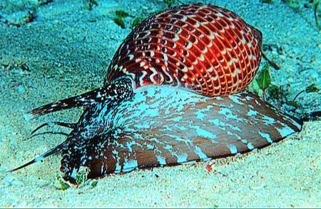 The partridge tun, Tonna perdix, kills its prey by injecting acid into the body of its victim. The snail then tears it into small pieces with its hook-like jaws. | |